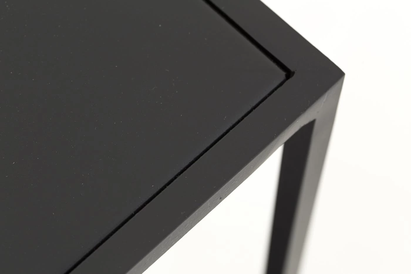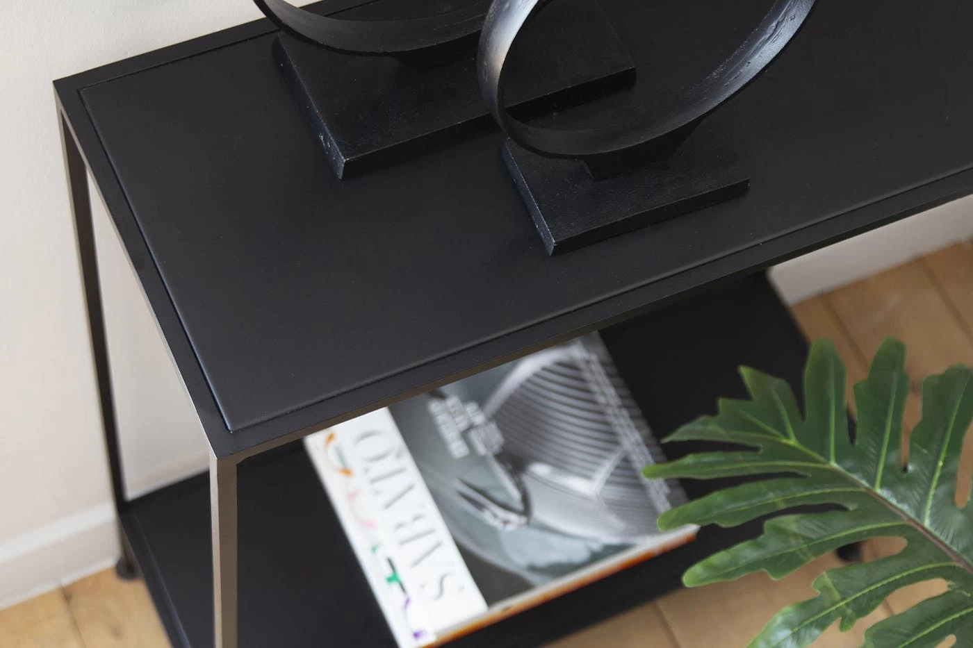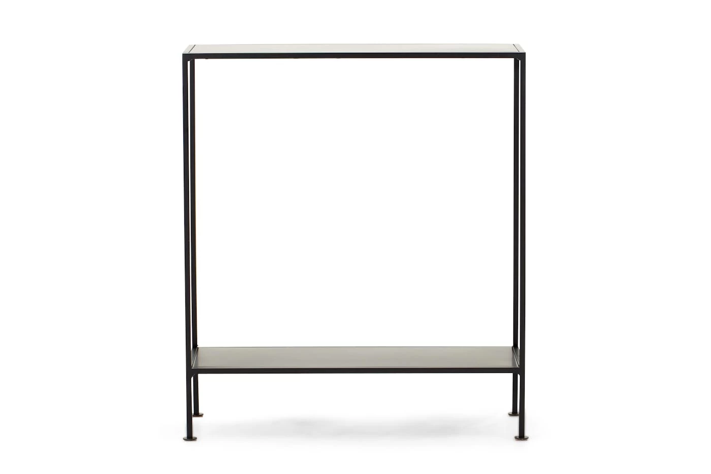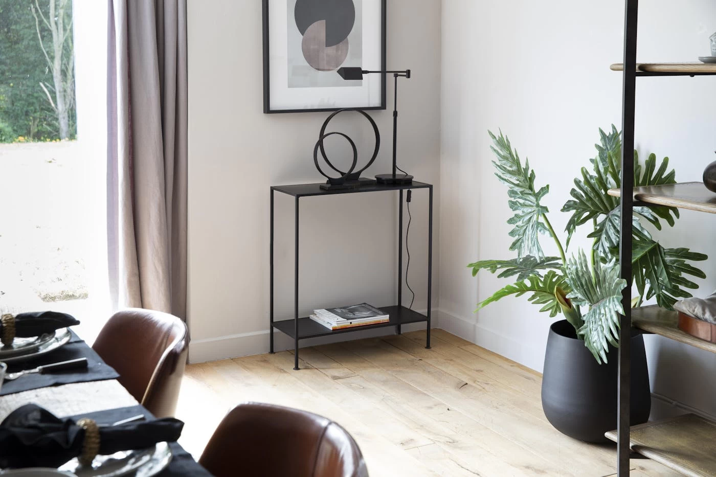 The elegant Cosa console table is fashioned from wrought iron in a contemporary execution. A linear frame with a faded gilded look holds two pitch black iron blades. The design, inspired by Art Deco styles has a strict and geometrical feel at first glance, however the antique finish adds a textured softness. The modest proportions make it a subtle and sophisticated addition to any interior.
