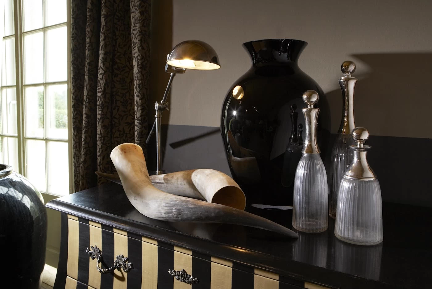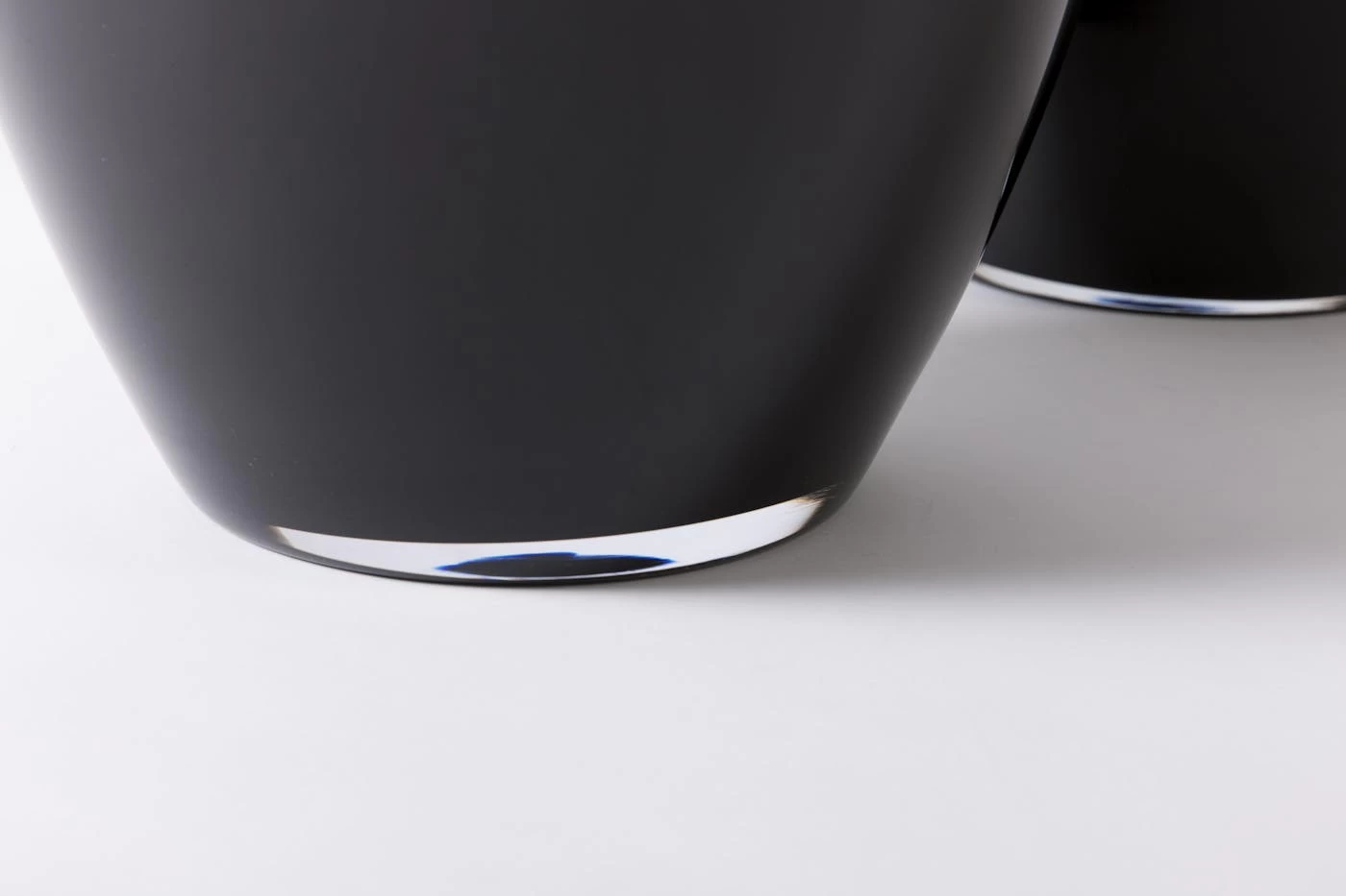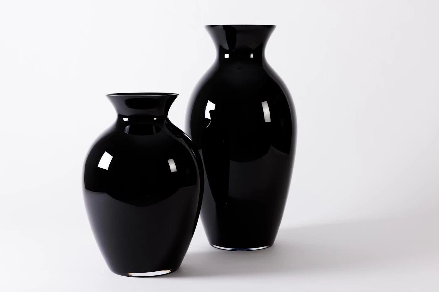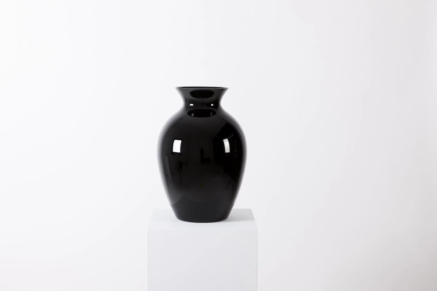 This distinguished black vase with grand dimensions boasts a stunning shine, elegant curved shape, and wide rim. Mouth-blown for a superior artisan quality, this prime product creates a grand atmosphere wherever it is placed.