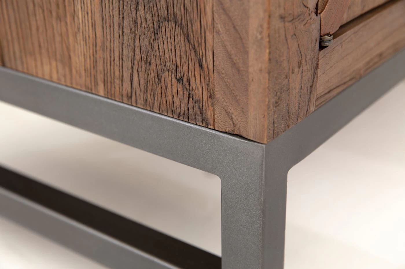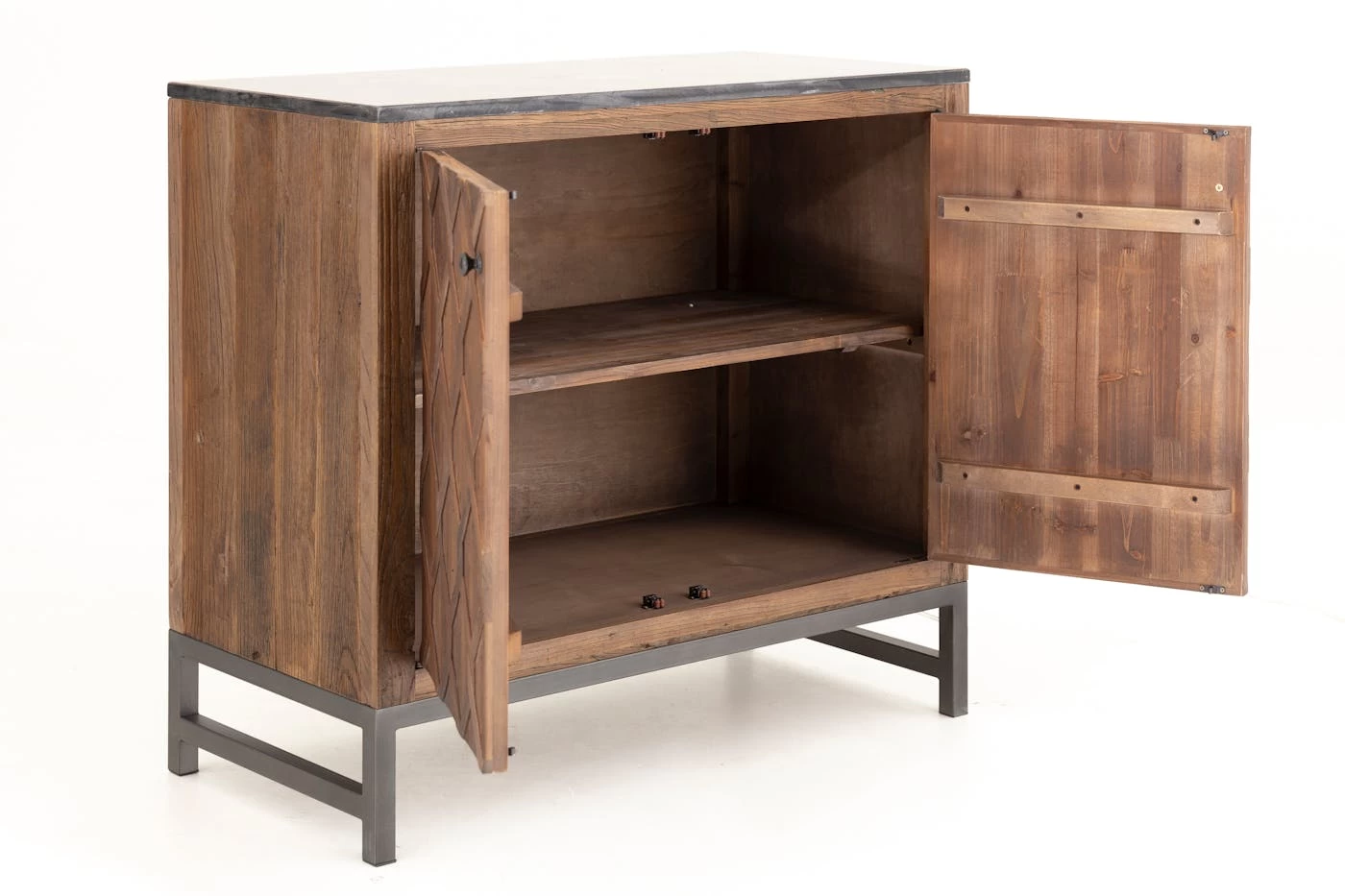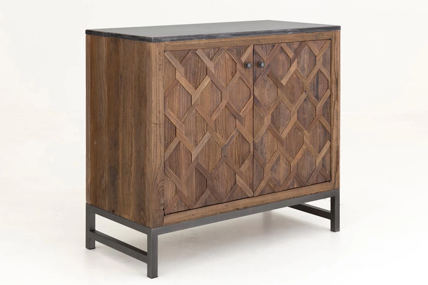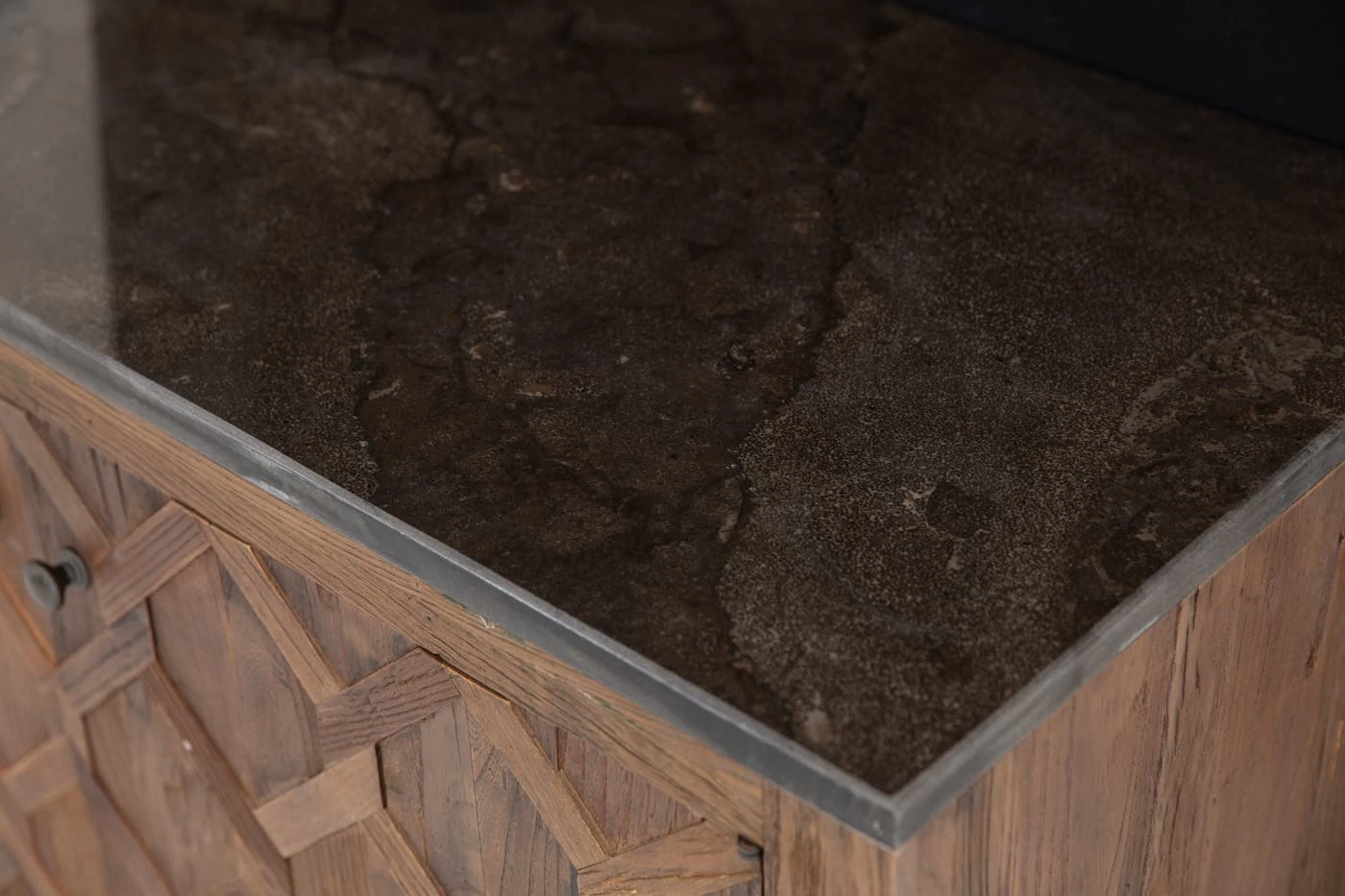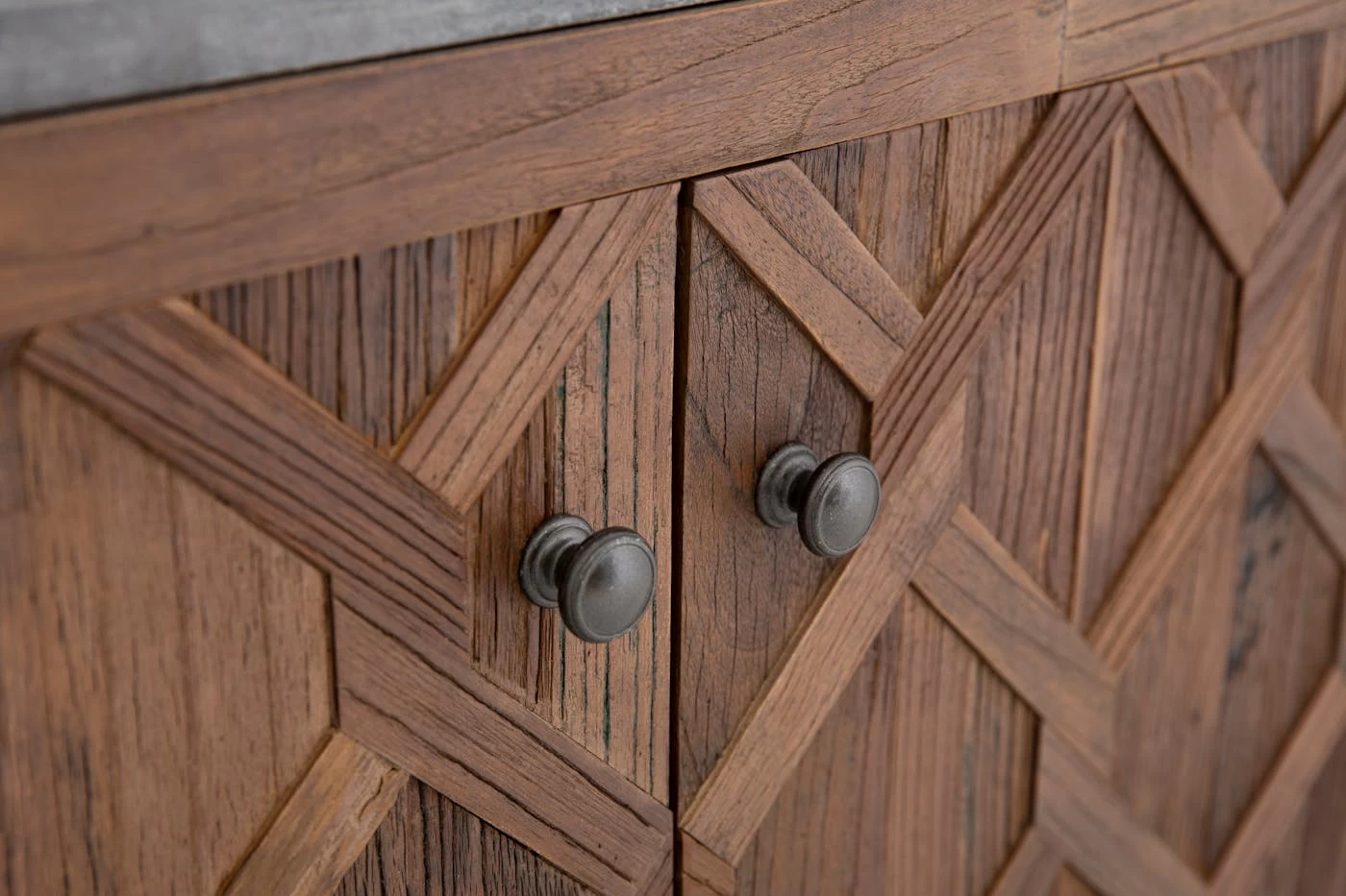Door panels with inlaid pieces of recycled wood and a top in natural stone: this mixed-material sideboard combines durable materials with a unique design. Inspired by 18th-century French château floors and finished with rich detailing: what’s not to love?